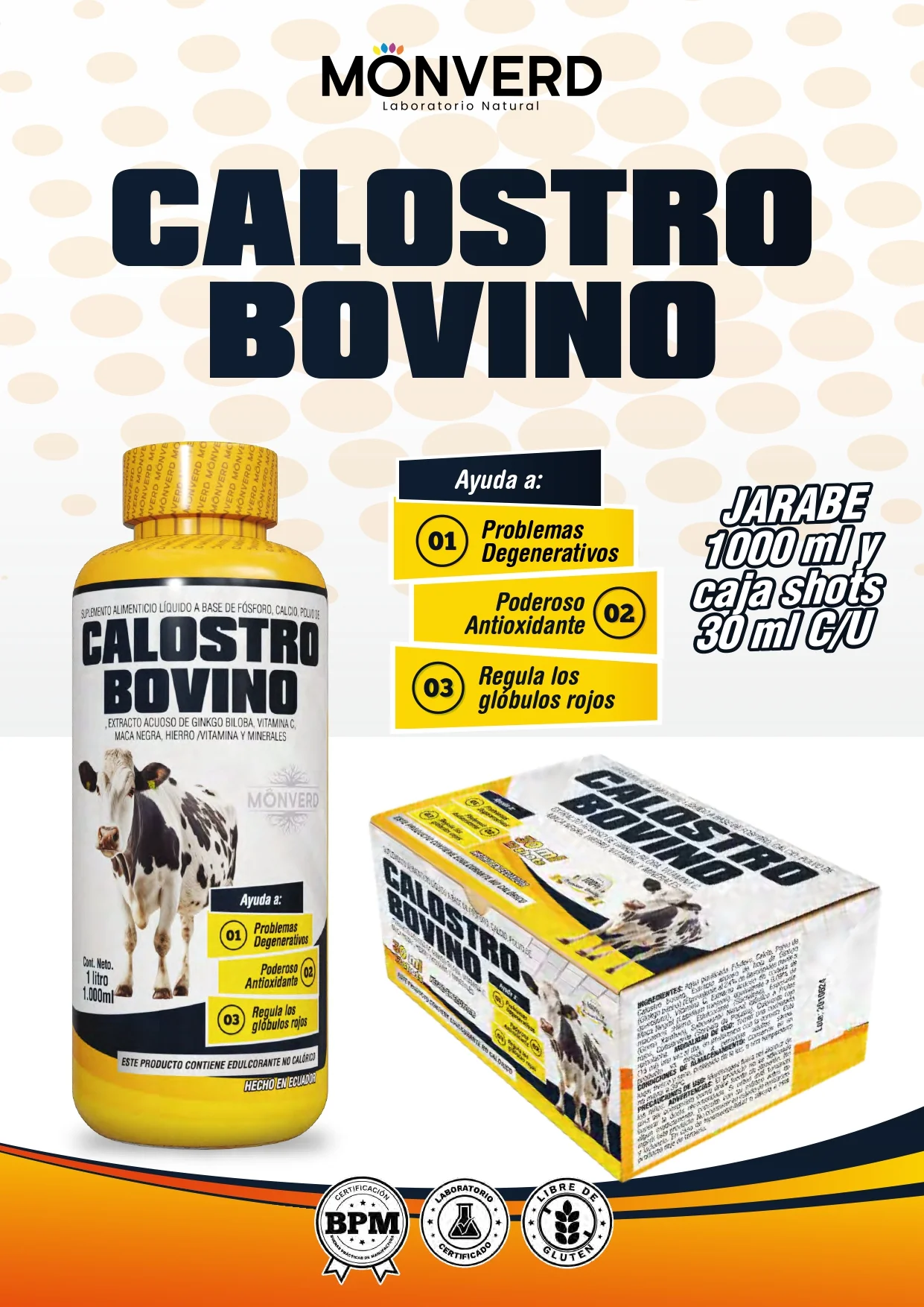 Calostro bovino es un jarabe natural enriquecido con vitaminas, minerales y extractos como ginkgo biloba y maca negra, diseñado para fortalecer el organismo desde el interior.