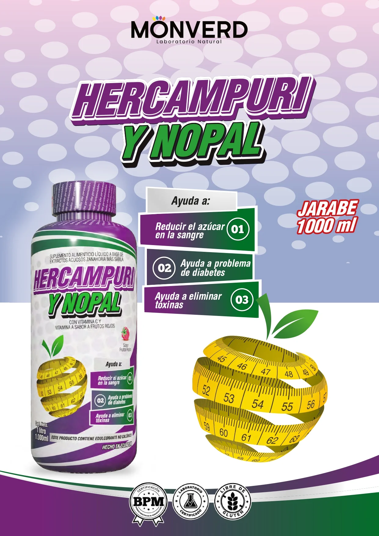 Hercampuri y nopal es un jarabe natural formulado con extractos vegetales que ayudan a regular los niveles de azúcar en la sangre y mejorar la depuración del organismo.