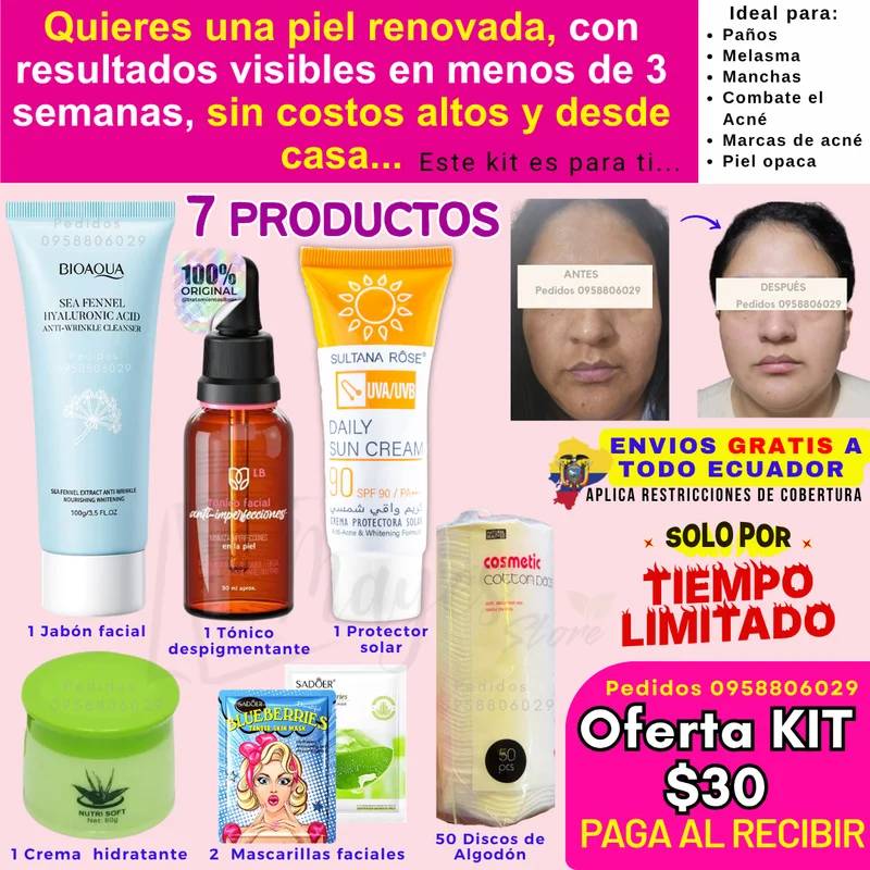 Es un kit completo con varios productos diseñados para mejorar la apariencia de la piel, reducir manchas y lograr un rostro más uniforme.