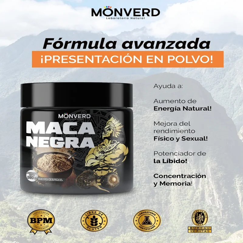 Maca Negra Monverd es un suplemento natural en polvo diseñado para potenciar la energía, el rendimiento físico y el bienestar general.